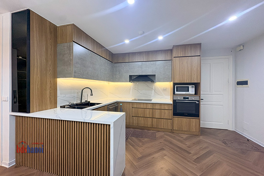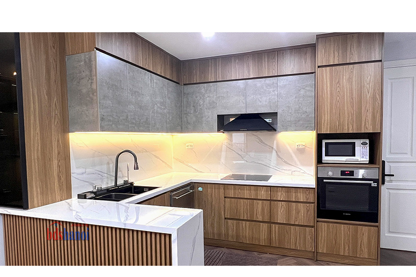 Khu vực bếp hiện đại, với đầy đủ thiết bị như bếp từ, máy rửa bát, lò nướng âm, tủ lạnh side by side