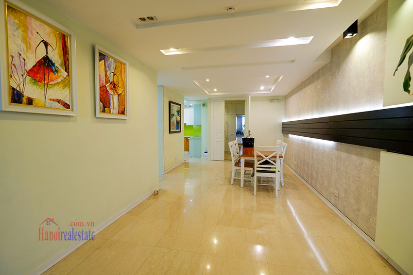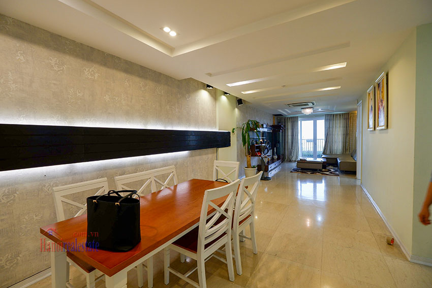 Diện tích căn hộ là 145m2, gồm 3 phòng ngủ, 2 vệ sinh, nhà kho. Căn hộ này đã được cải tạo lại khu vực bếp, và dỡ bở công trình phụ còn thừa. Căn hộ view nhìn ra sân Gôn của Ciputra từ ban công phòng khách và cửa sổ kính lớn của phòng ngủ chính