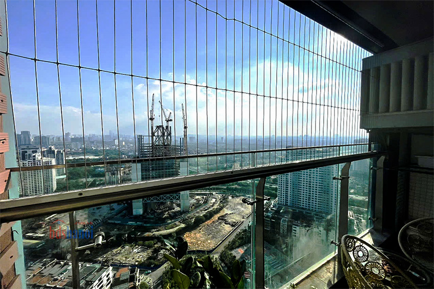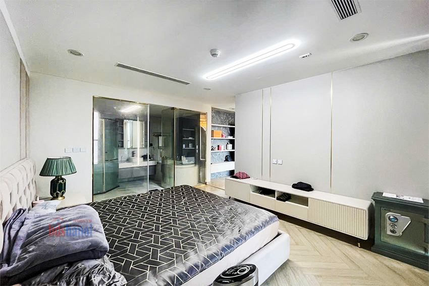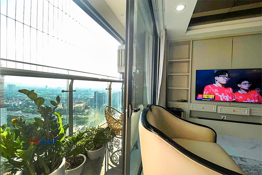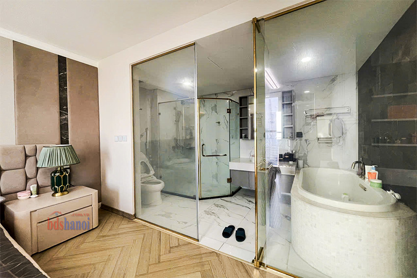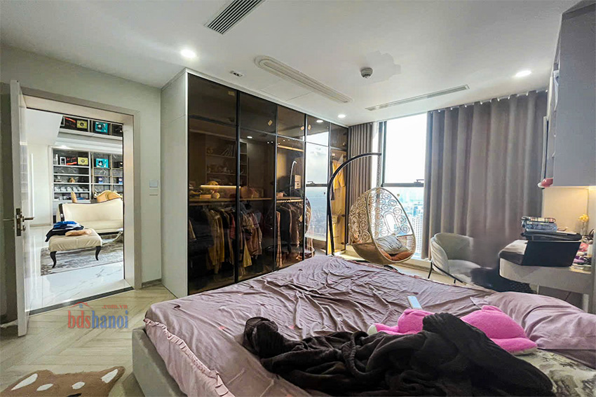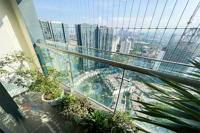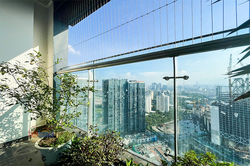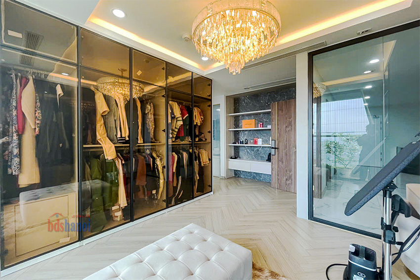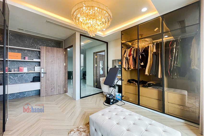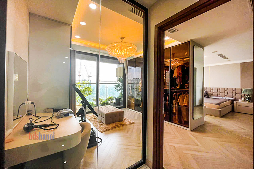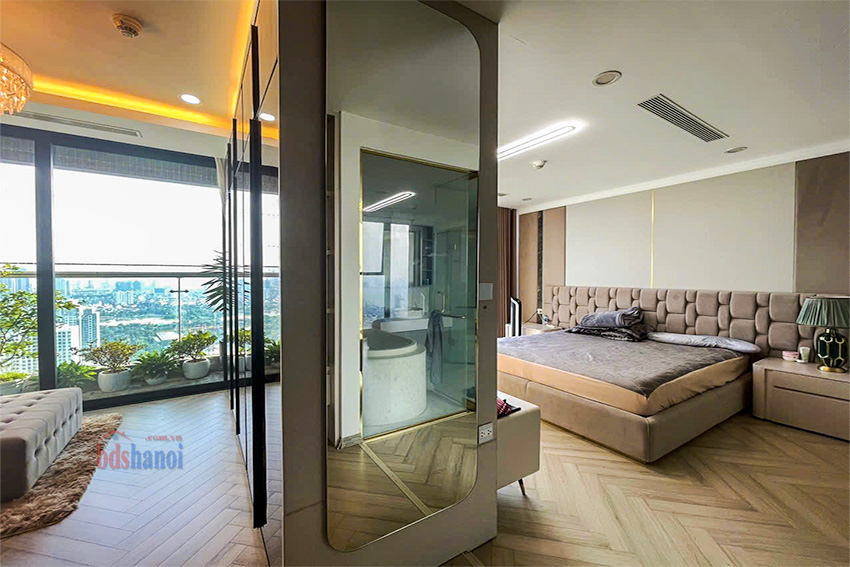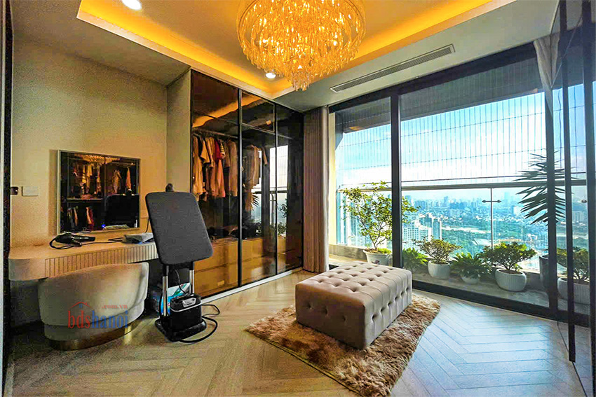 Từ ban công (như trong hình ảnh) có thể quan sát toàn cảnh khu đô thị Ciputra và hướng Sông Hồng. Các phòng ngủ cũng sở hữu cửa sổ lớn, tối ưu hóa tầm nhìn và ánh sáng. Hình ảnh thực tế cho thấy phòng thay đồ (walk-in closet) được thiết kế riêng biệt với hệ tủ kính, liền kề phòng tắm master có bồn tắm.