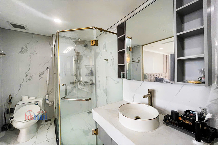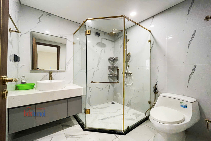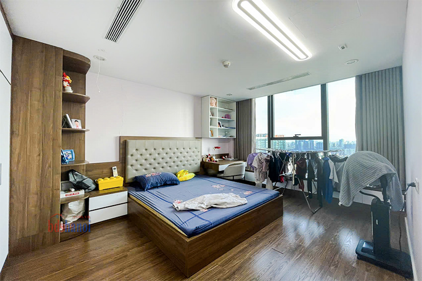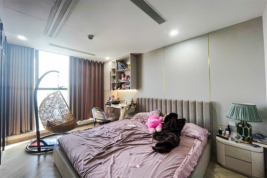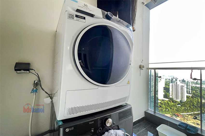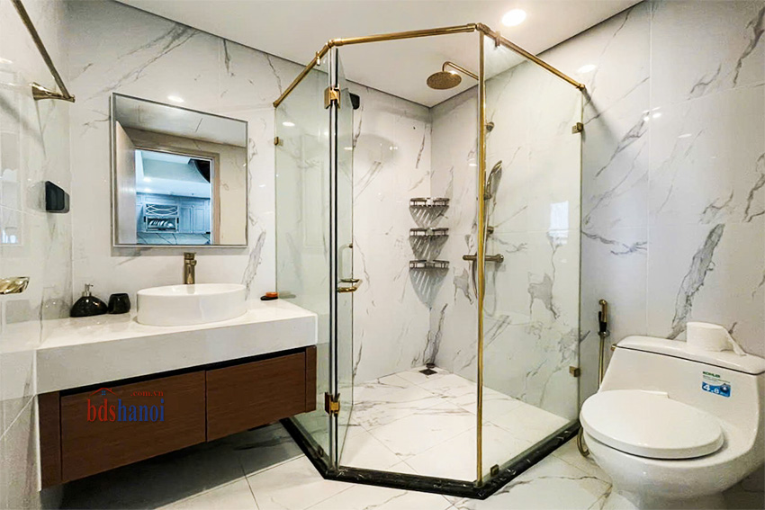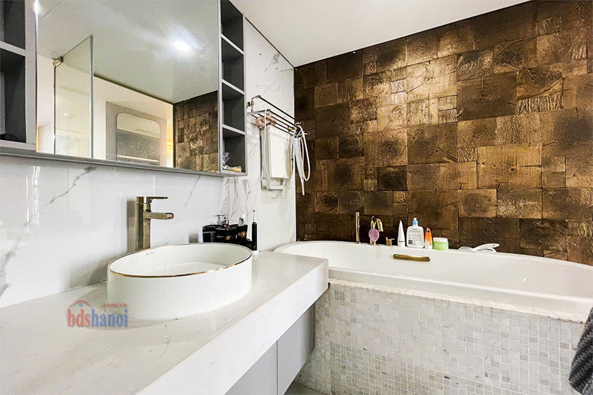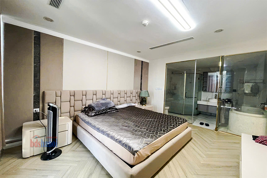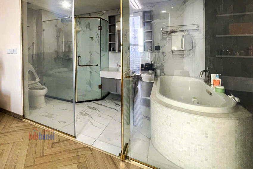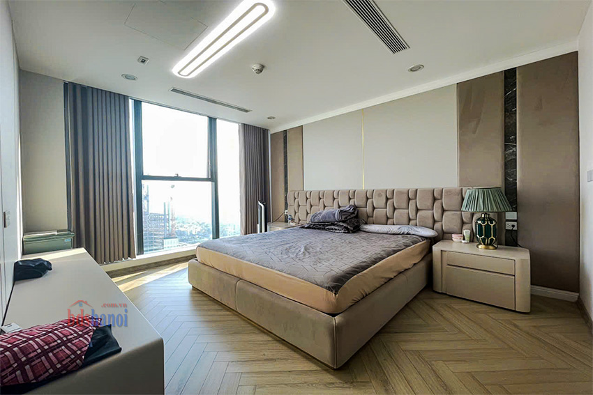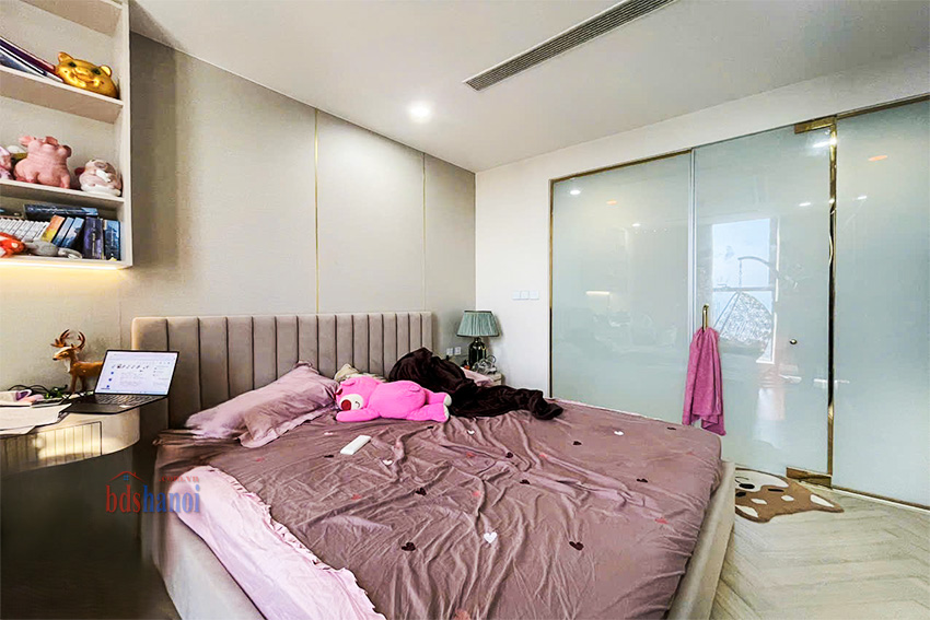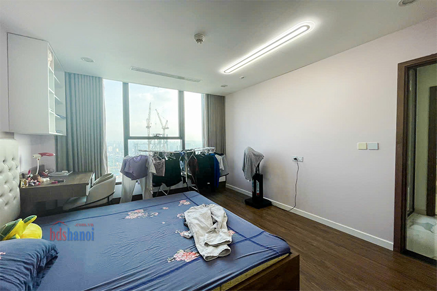 Từ ban công (như trong hình ảnh) có thể quan sát toàn cảnh khu đô thị Ciputra và hướng Sông Hồng. Các phòng ngủ cũng sở hữu cửa sổ lớn, tối ưu hóa tầm nhìn và ánh sáng. Hình ảnh thực tế cho thấy phòng thay đồ (walk-in closet) được thiết kế riêng biệt với hệ tủ kính, liền kề phòng tắm master có bồn tắm.