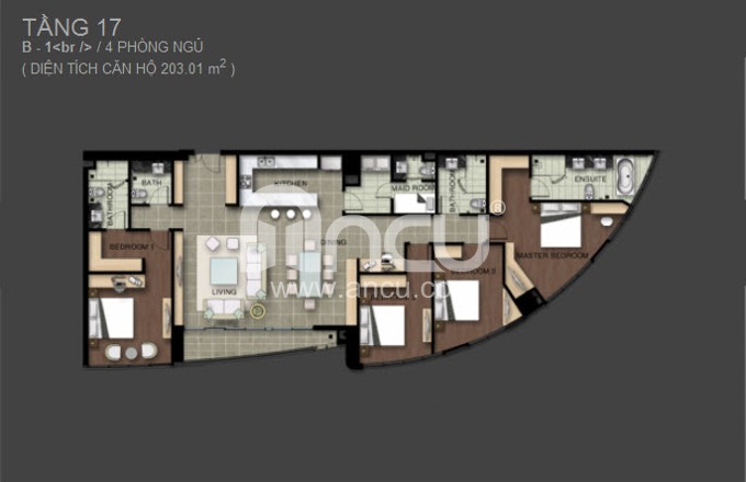 Căn hộ nằm tại tầng 17 của chung cư Watermark có 2 tòa A và B, toàn bộ 2 tòa chỉ có 2 căn hộ với diện tích và layout tương tự. Căn hộ được trang bị đủ sàn gạch chống trơn ở phòng khách, phòng ăn, bếp, nhà kho, ban công; sàn gỗ cao cấp tại các phòng ngủ, có cửa sổ nhìn ra Hồ Tây.