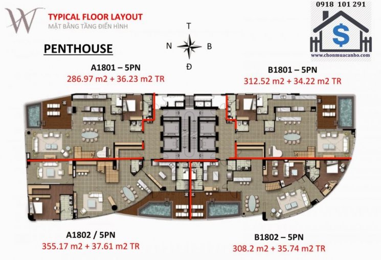 - Tầng 18 có duy nhất 4 căn penthouse gồm 2 căn trên 300m2 và 2 căn trên 200m2, 4 thang máy trên 1 sàn, mật độ cư dân rất ít nên không bao giờ có tình trạng chờ thang máy hay chen lấn.