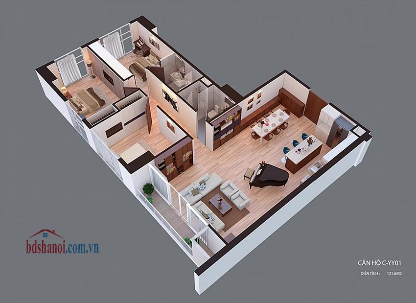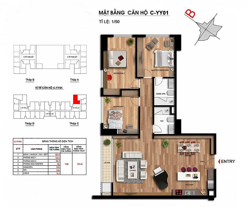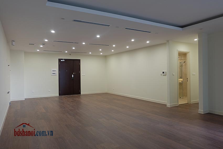 - Diện tích căn hộ 129m2 tim tường, và 121,6m2 thông thủy, 3 phòng ngủ, 2WC, cửa Tây Bắc, ban công Đông - Đông Nam, nội thất cơ bản (thiết bị vệ sinh, điều hòa, sàn gỗ, trần thạch cao).