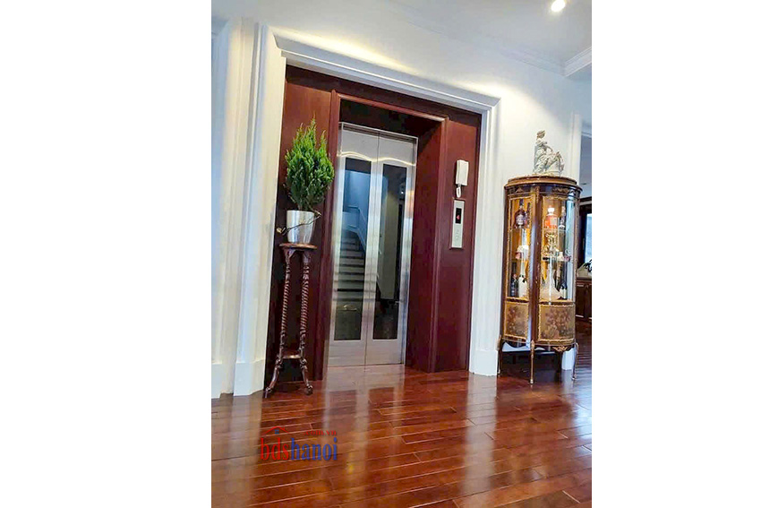 Một điểm nổi bật của căn biệt thự là thang máy Nhật Bản vận hành êm ái – tiện lợi cho người lớn tuổi và trẻ nhỏ. Nội thất trong nhà được đầu tư cao cấp với tông gỗ óc chó tối giản, tạo cảm giác sang trọng nhưng không cầu kỳ, phù hợp với những khách hàng yêu thích không gian sống tinh tế, hiện đại.